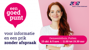 Prik zonder afspraak 14 oktober 2021Op 15 oktober en 5 november kunt u terecht bij Gemeentehuis Putten voor een COVID vaccinatie zonder afspraak. Het gaat om een vaccinatie met Pfizer.